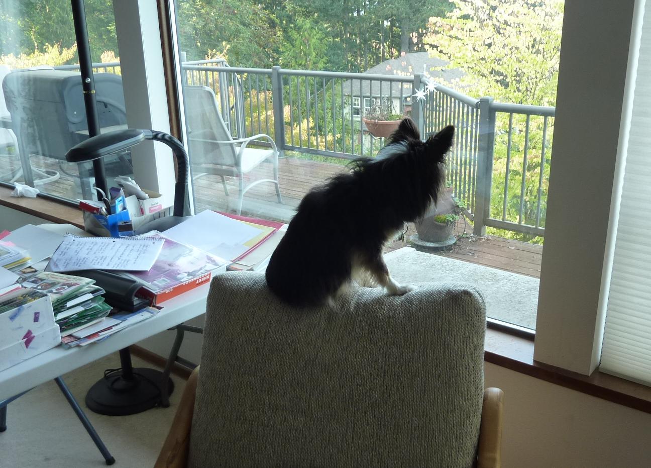 a cat comes & sits on the deck box just below the window & drives Luna insane. The cat totally ignores her frantic barking.