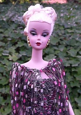 Cappucine in Alex's pink/gray matrix sheath + capelet, close-up (285x405)