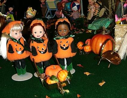 3 li'l pumpkins toting pumpkins in wheelbarrow (423x327)