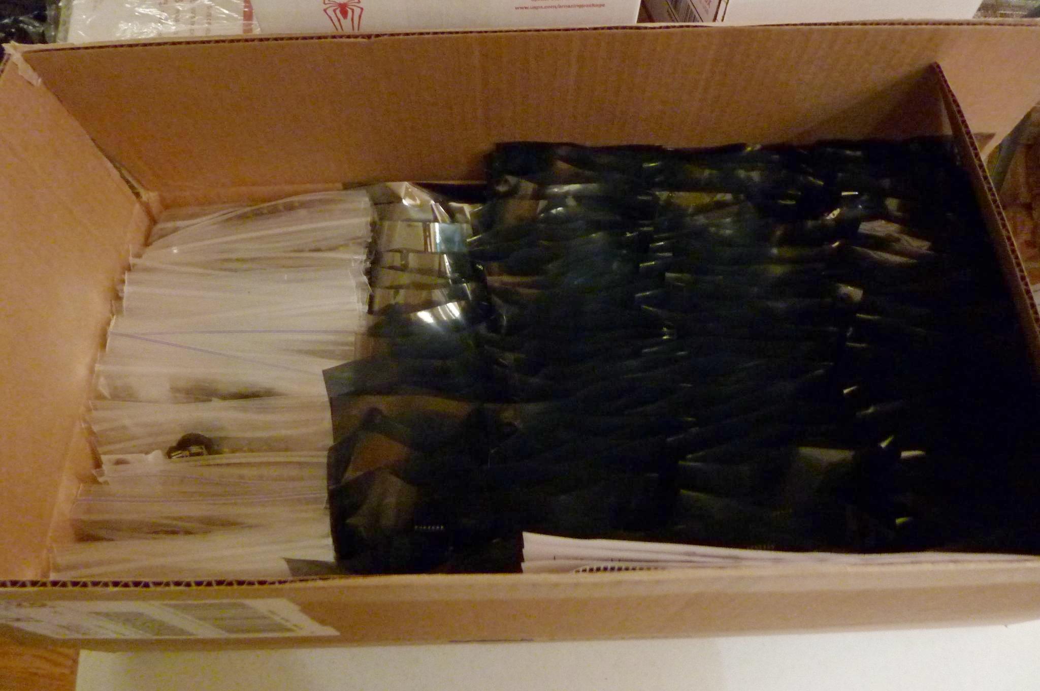 Here are the parts kits, all sitting in a box. You should get one snack-size ziploc with the discretes, one anti-static bag with chips and sockets, and a board, for each kit you have ordered. You should also get a printed sheet with the most important release notes as of wheever your board was shipped. |