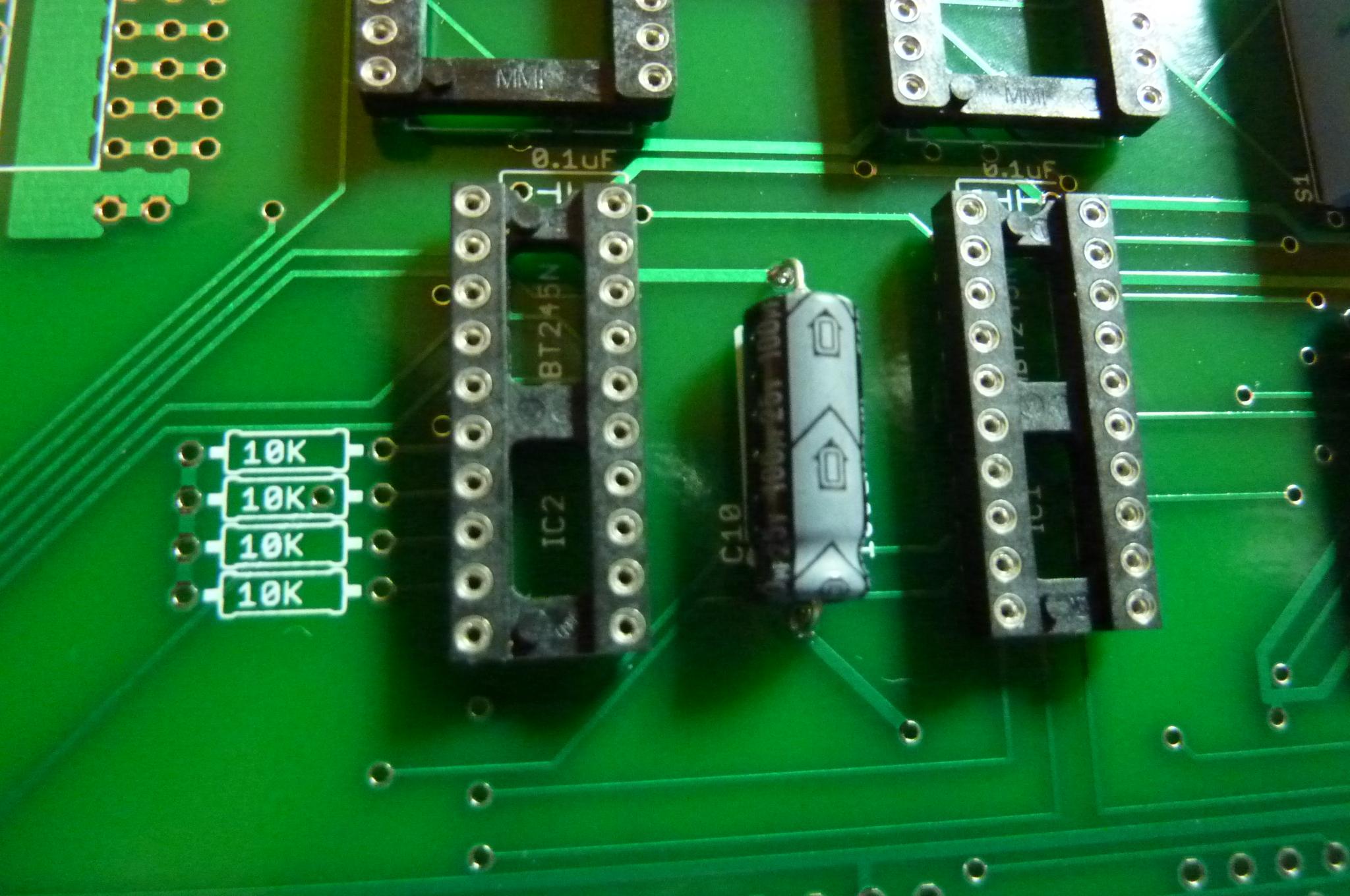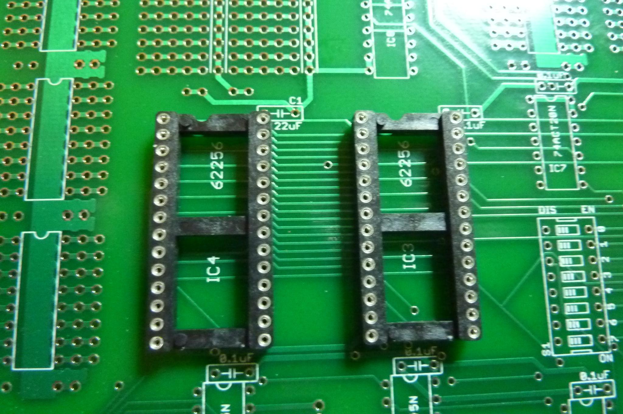 Start out by inserting the largest IC sockets. Pin one goes on the end with a notch, so point the notch away from the edge connectors, as shown. Flip the board over and tack-solder diagonally opposite sides of the socket. Then pick up the board, and while pressing down gently on the socket, reheat the solder so that it is tacked as far into the board as it wants to go. (Don't burn your fingers!) Then finish soldering the socket into place. One note about these sockets. They are machine pin sockets, but the contacts aren't gold -- they are tin/lead. I think they are fine, but if you really wanted the gold ones, you'll have to provide them yourself (they are about twice the price of these). |