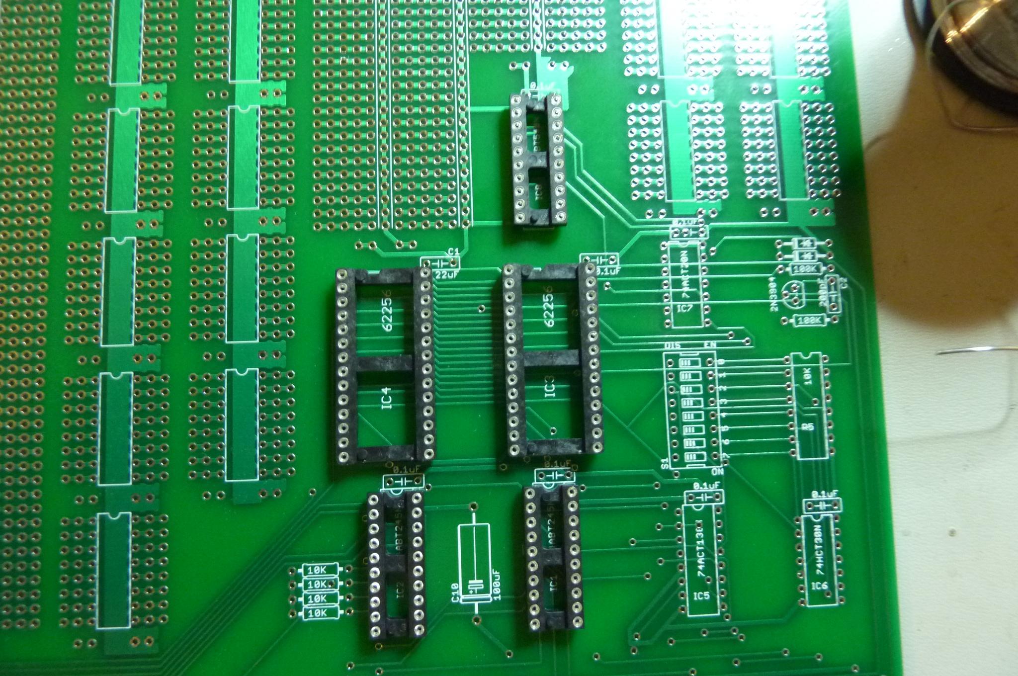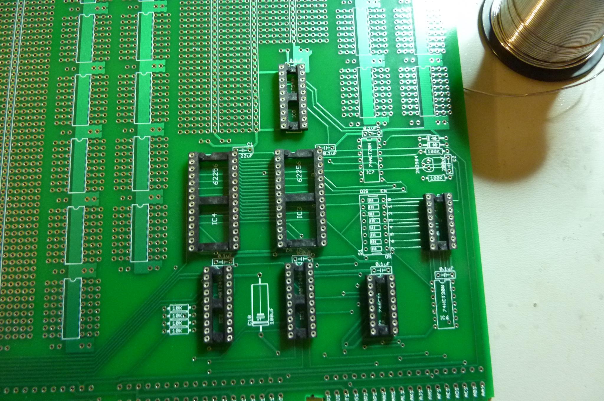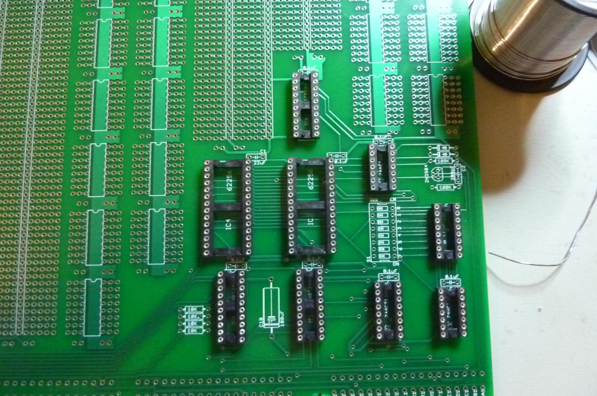Work your way through the successively smaller IC sockets. Working from large to small ensures you don't solder (for instance) a 14 pin socket into a place where the 16 pin socket should be. |