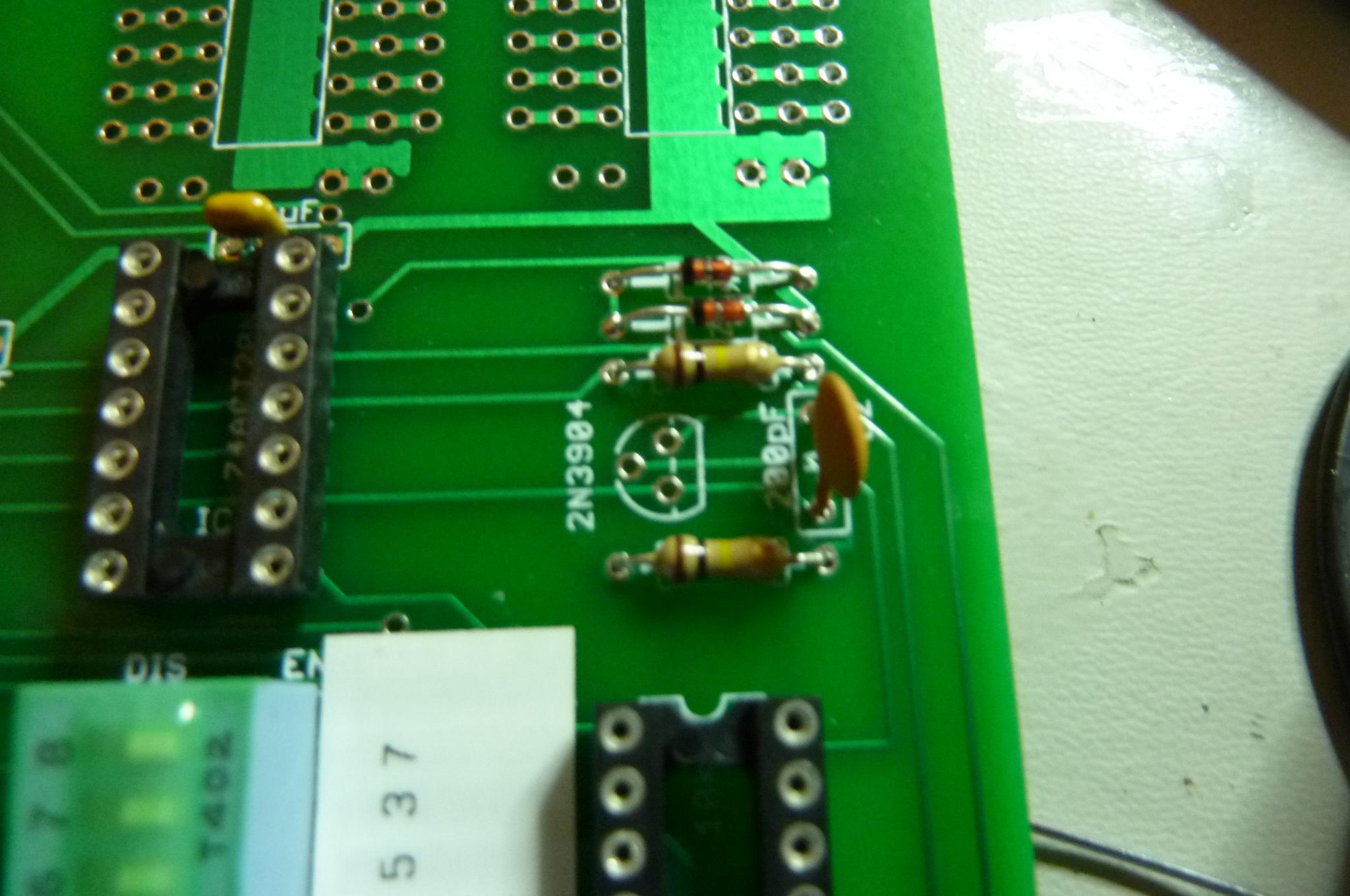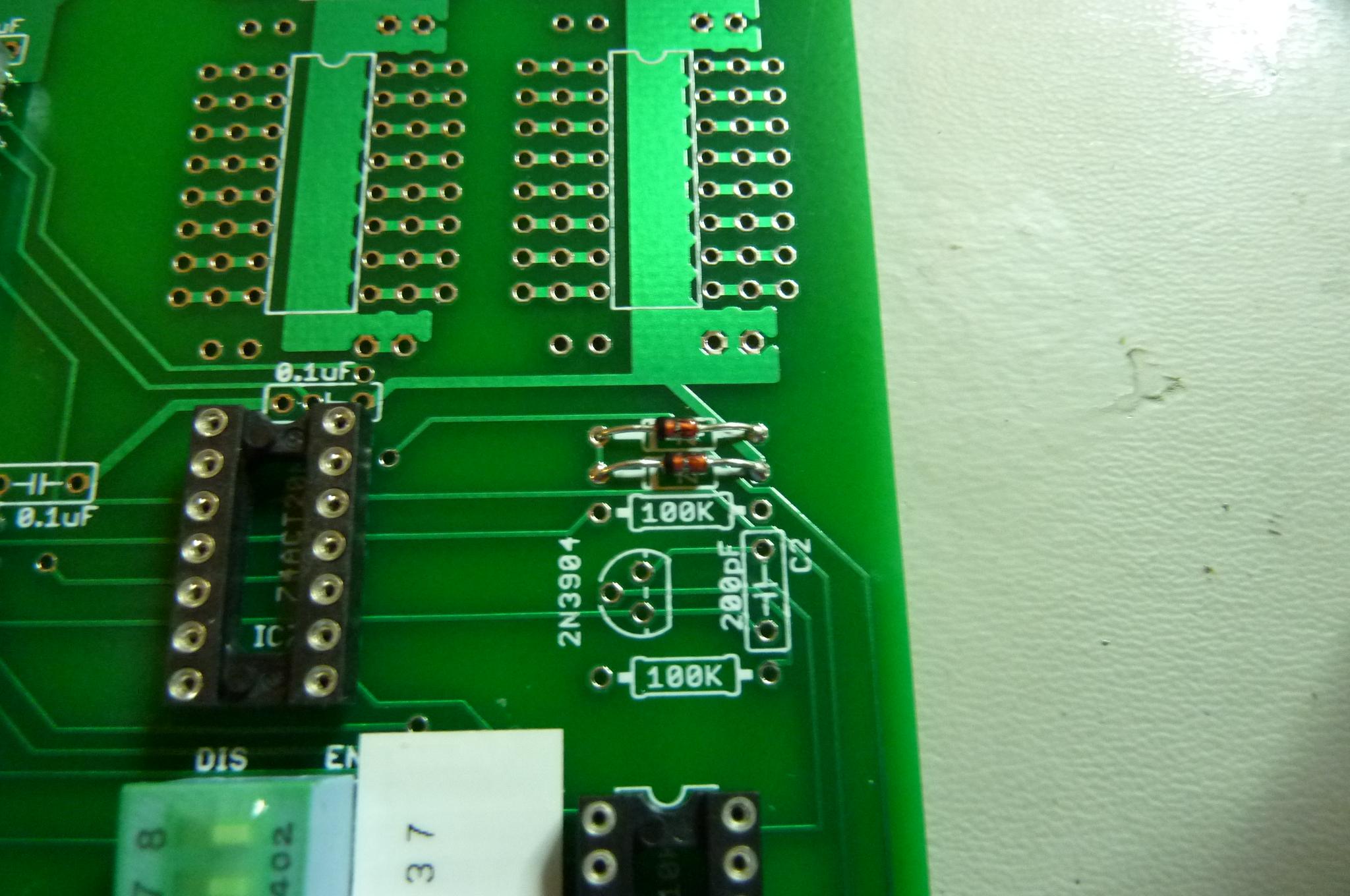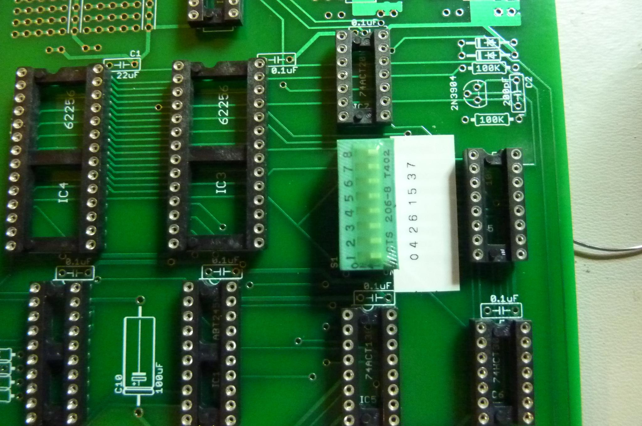 Solder in the DIP switch. The orientation shown will correctly make the "disabled" position to the left. The silkscreen is wrong about the dip switch orientation, and also about the ordering of the banks. I've made a little sticker which numbers the banks to match the actual implementation. It is also possible to cut traces and install blue wires to interchange pin 1 and pin 3 of IC5 (which is just below the DIP switch). This should make the switches correspond to the banks as indicated by the silk screen. |