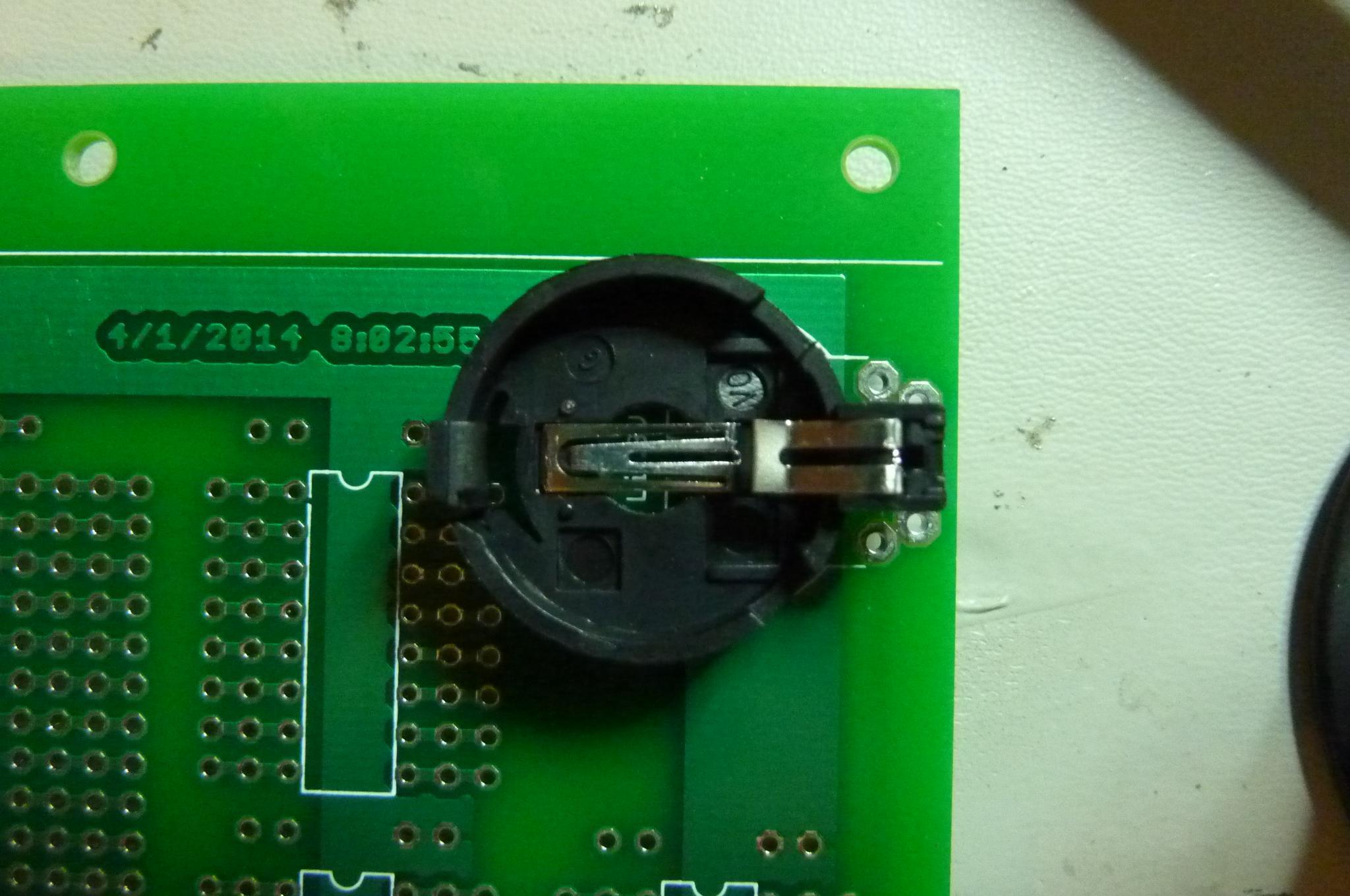 The battery holder goes as shown (8/A version in lower pic). Be sure to get it flat to the board, and yes, the "+" lead hole is oversized. You might also need a little more heating time to make sure these don't end up with cold solder joints. Be sure to trim the "+" lead flush when you are done. |