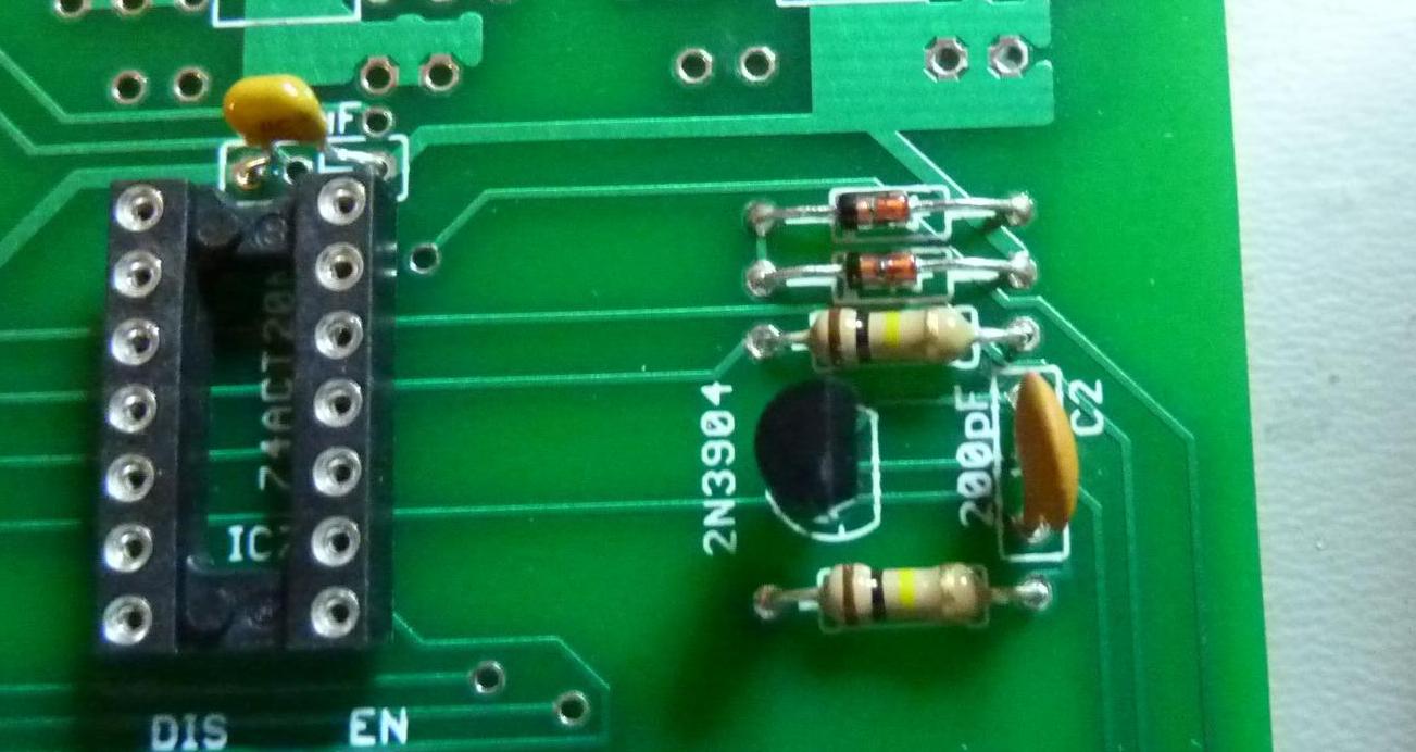 Solder in the electrolytic. This is a polarized component, so be sure that the "-" end is away from the edge connector, and the ridged end is toward them, as shown. Bend the long leads slightly after inserting, so that the part doesn't fall back out. Trim the leads after soldering. |