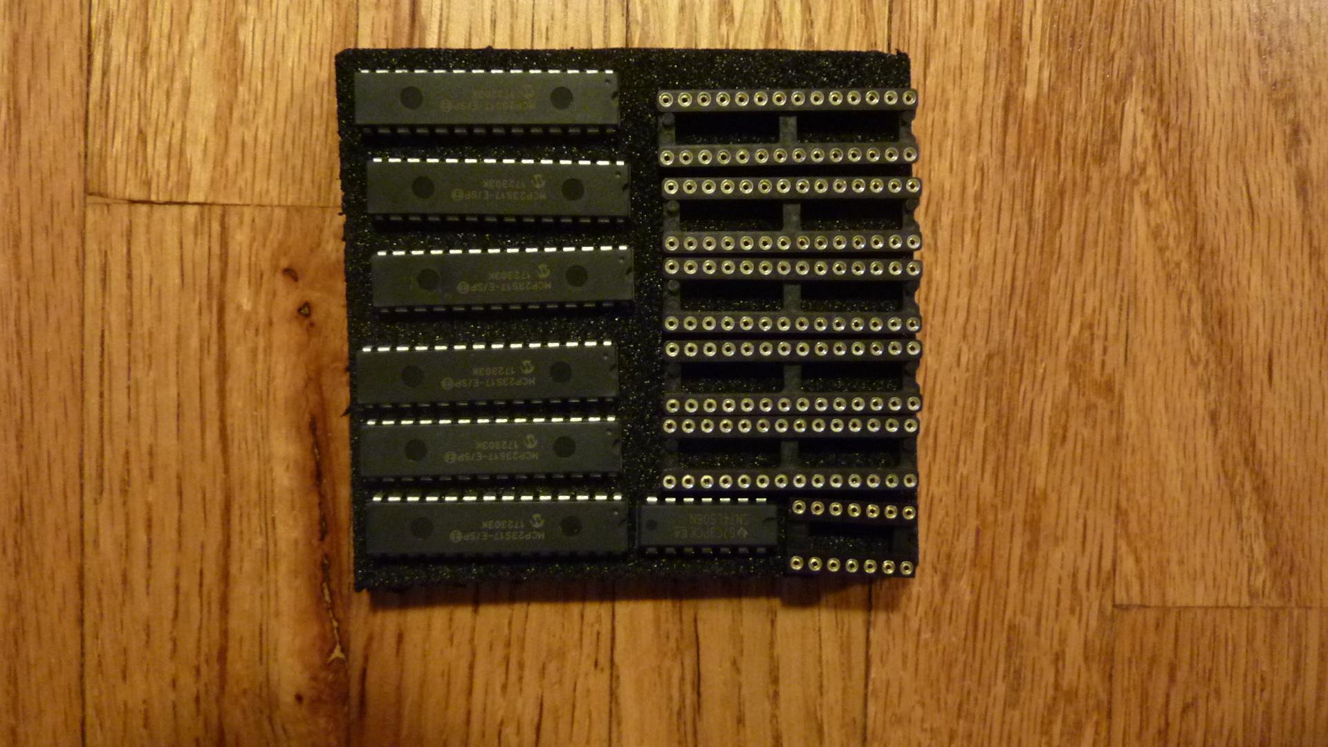 Working our way up, install the IC sockets. The notches should point toward the side of the board which will get the switch and the LEDs.