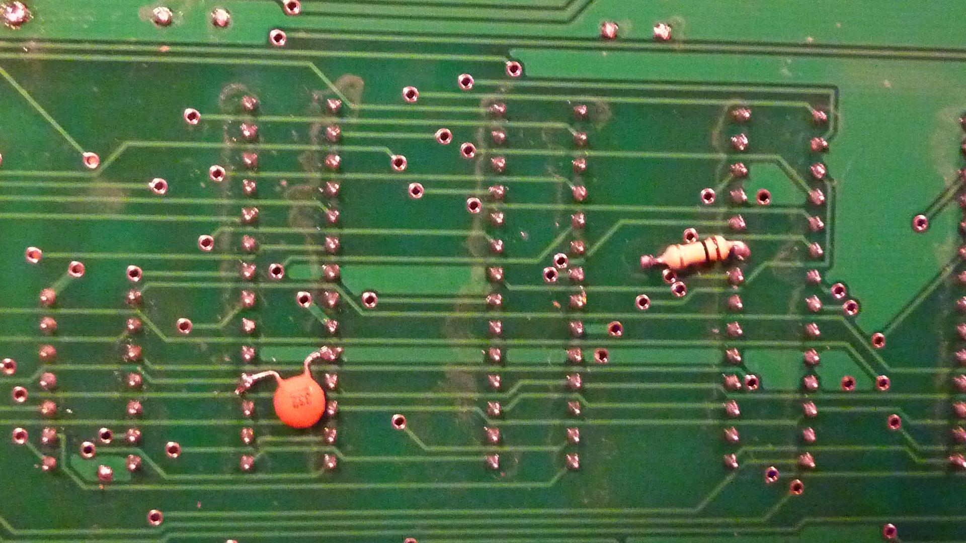 To fix this, locate pin 23 of IC3, and the wider trace that runs from it to a nearby via. Cut this trace, then install a 100K ohm resistor from the via to the pin (click photos to enlarge them):